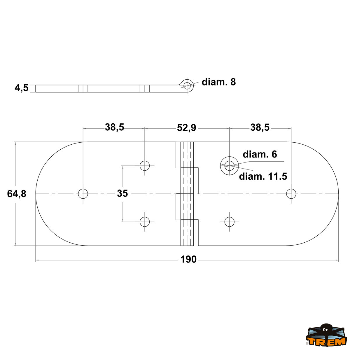 AISI 316 stainless steel hinge 190x65 mm with pins