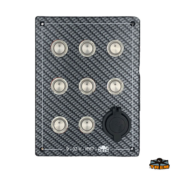Finitura in finto carbonio. Interruttori a luce bianca.Pulsanti/interruttori in Aisi 316 con grado di protezione IP67. 9-32 Volts. For-nito interamente pre-cablato con cappuccio per facilitare il cablaggio dell’utenza desi-derata e l’eventuale intervento su un guasto. Provvisto di manuale d’installazione. Pulsanti e interruttori omologati CE.