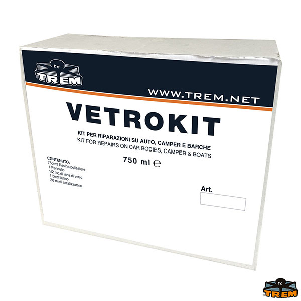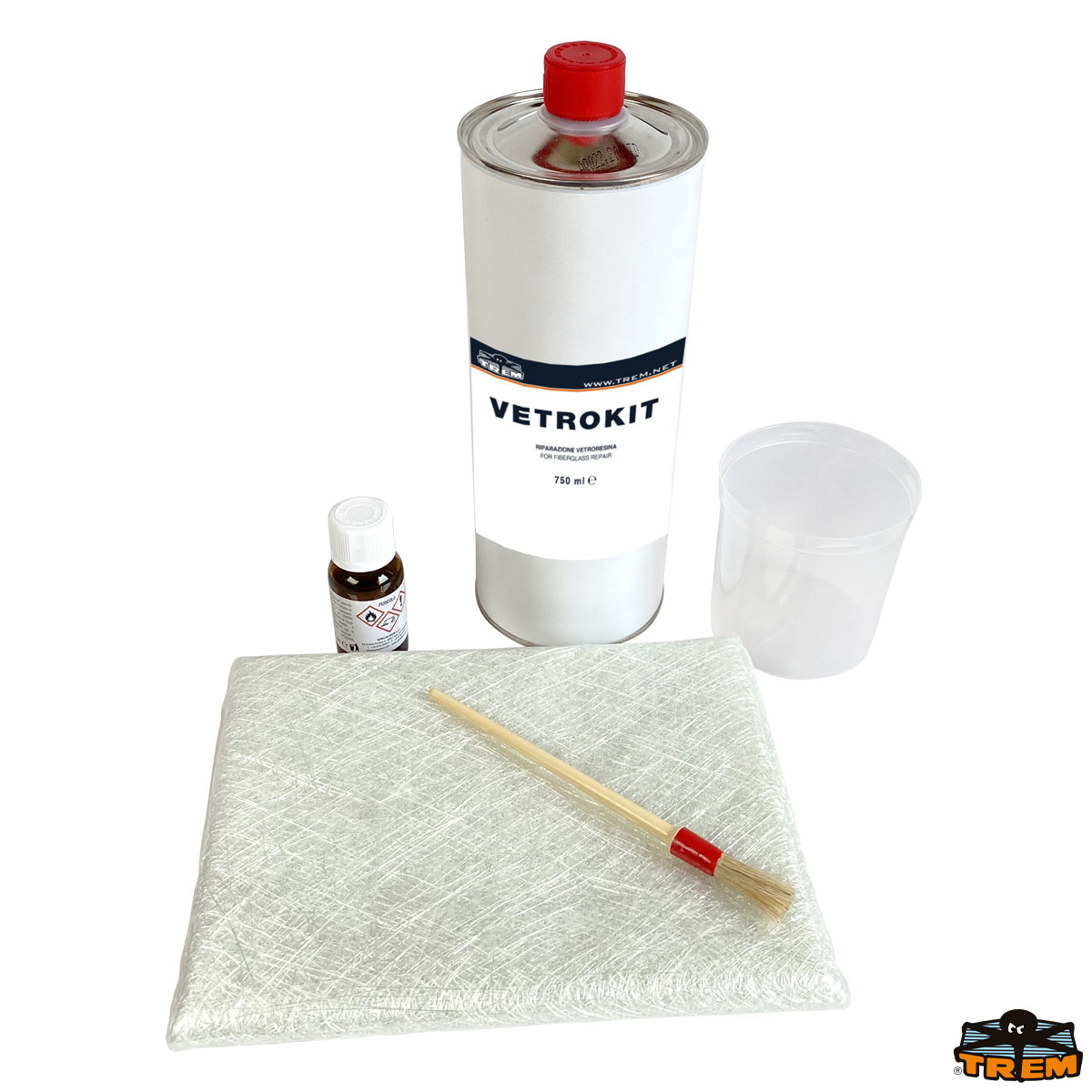 Composto da: resina poliestere 750 g, ca-talizzatore, tessuto in fibra di vetro 64x47 cm, vaschetta miscelatore, pennello.