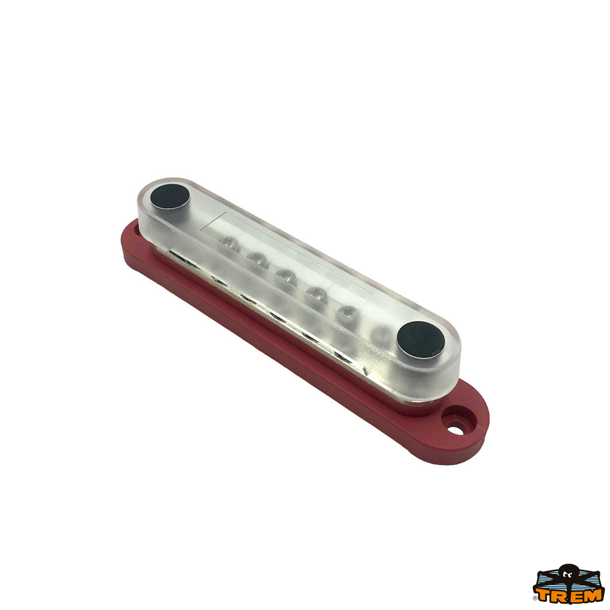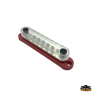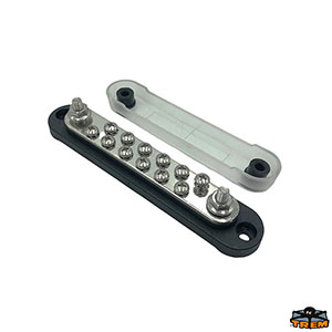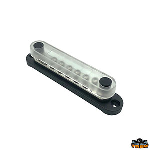 Connection bar with insulated base, stainless steel terminals and transparent protective cover. 2 M6 threaded pins + 12 M4 screws. 150A 48VDC/300VAC.