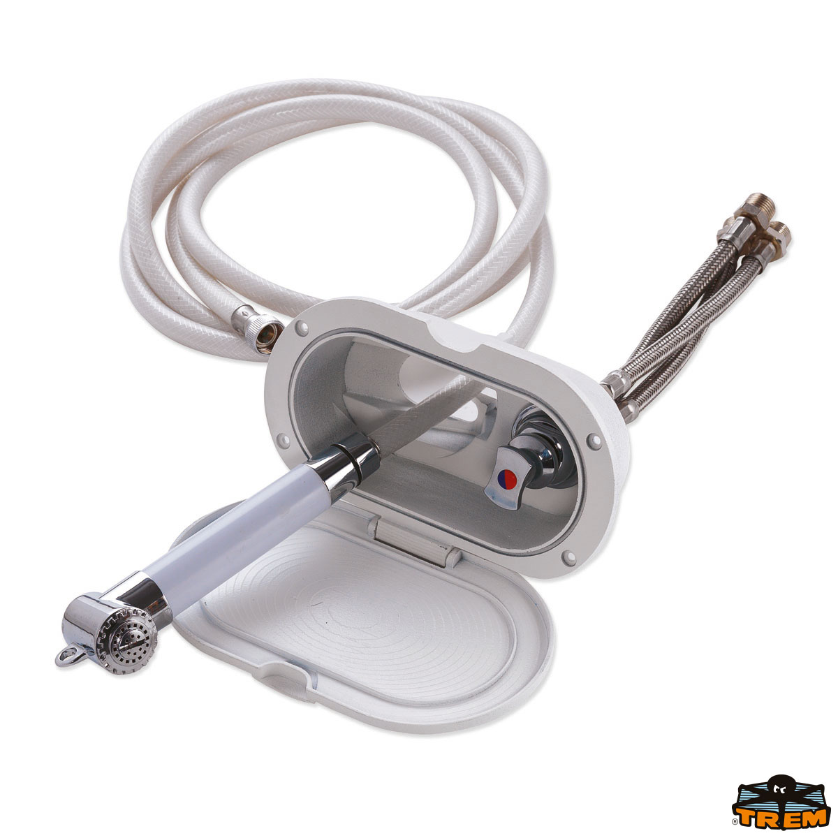 Doccia in plastica cromata, vano di alloggiamento bianco in ASA UV resistente.