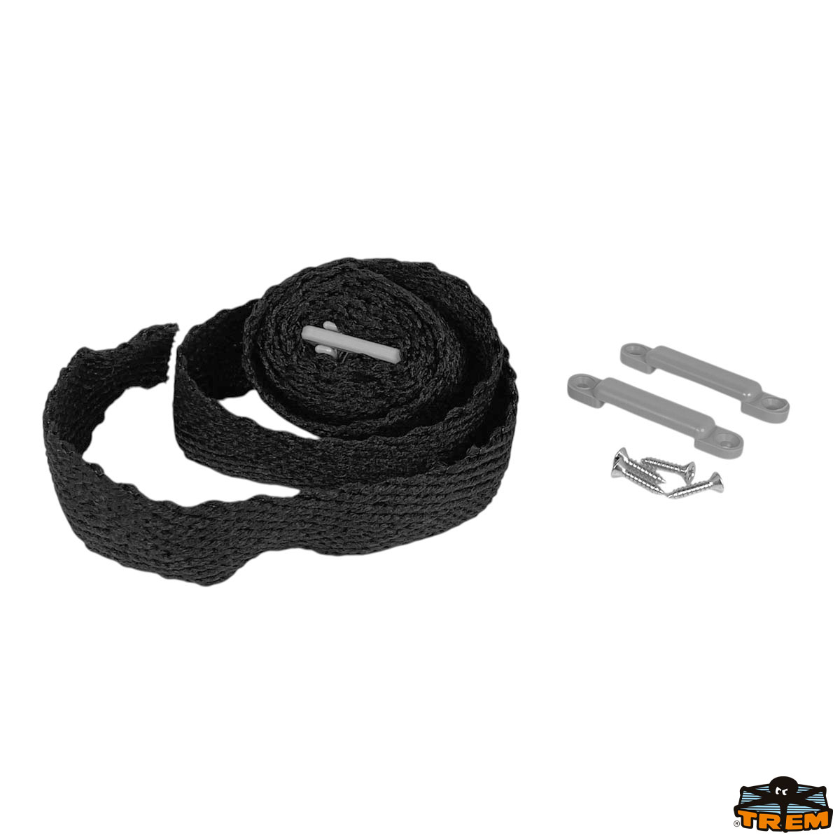 Cinghia completa di fibbie di regolazione e di due ponticelli da applicare sul fondo dell’imbarcazione. Con viti autofilettanti.