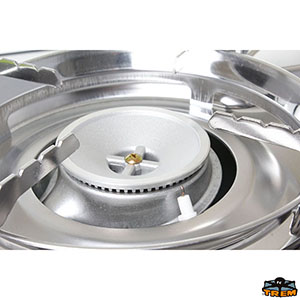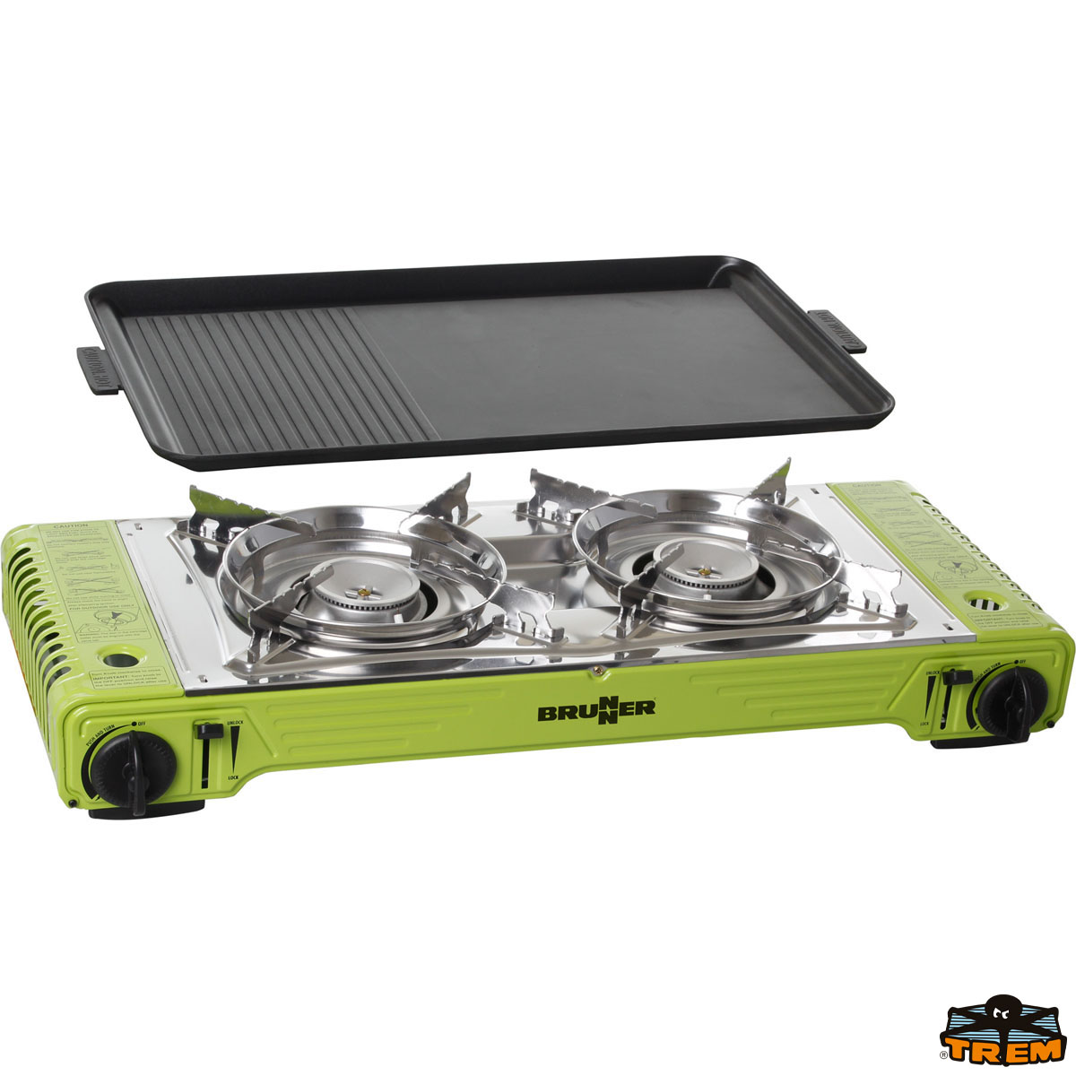 Fornello gas a cartuccia a 2 fuochi con piastra grill in fusione di alluminio.
