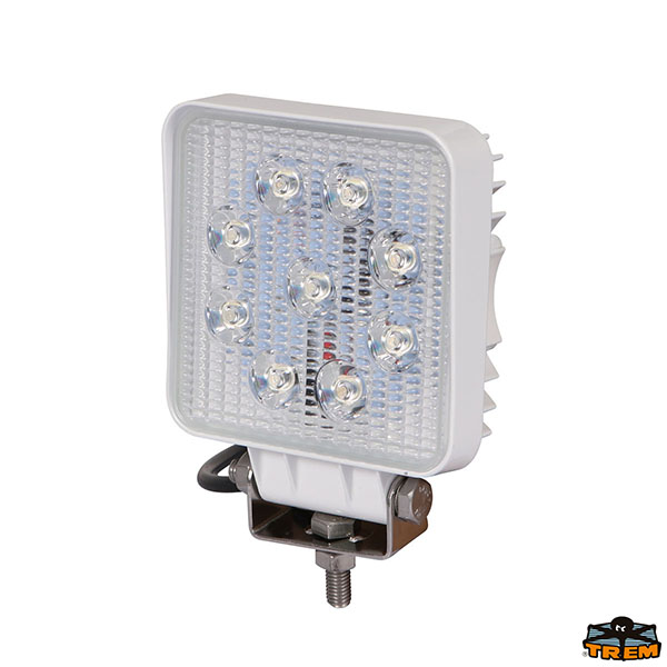 Fonte luminosa: 9 led x 3W. Tensione operativa: 10-30VDC. Carcassa Alu quadrato bianco. Temperatura colore: 6000K. Potenza: 27 Watt. Lumens 1600.