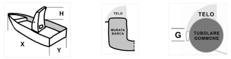 PREMESSA: i teli sono misurati e realizzati in piano, ecco perchè se sulla vostra barca o gommone vi sono eventuali altezze (H) di consolle e/o T-Top devono essere sommate alle misure lunghezza (X), larghezza (Y).