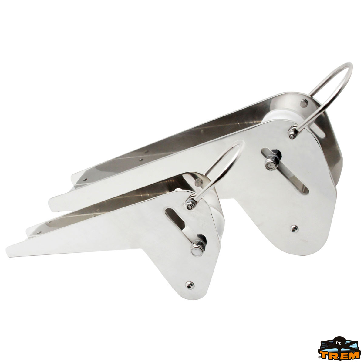 In acciaio inox lucidato, fabbricato in lamiera. Sfrutta la forma delle Bruce e Trefoil al fine di essere autobloccante. Puleggia in nylon.