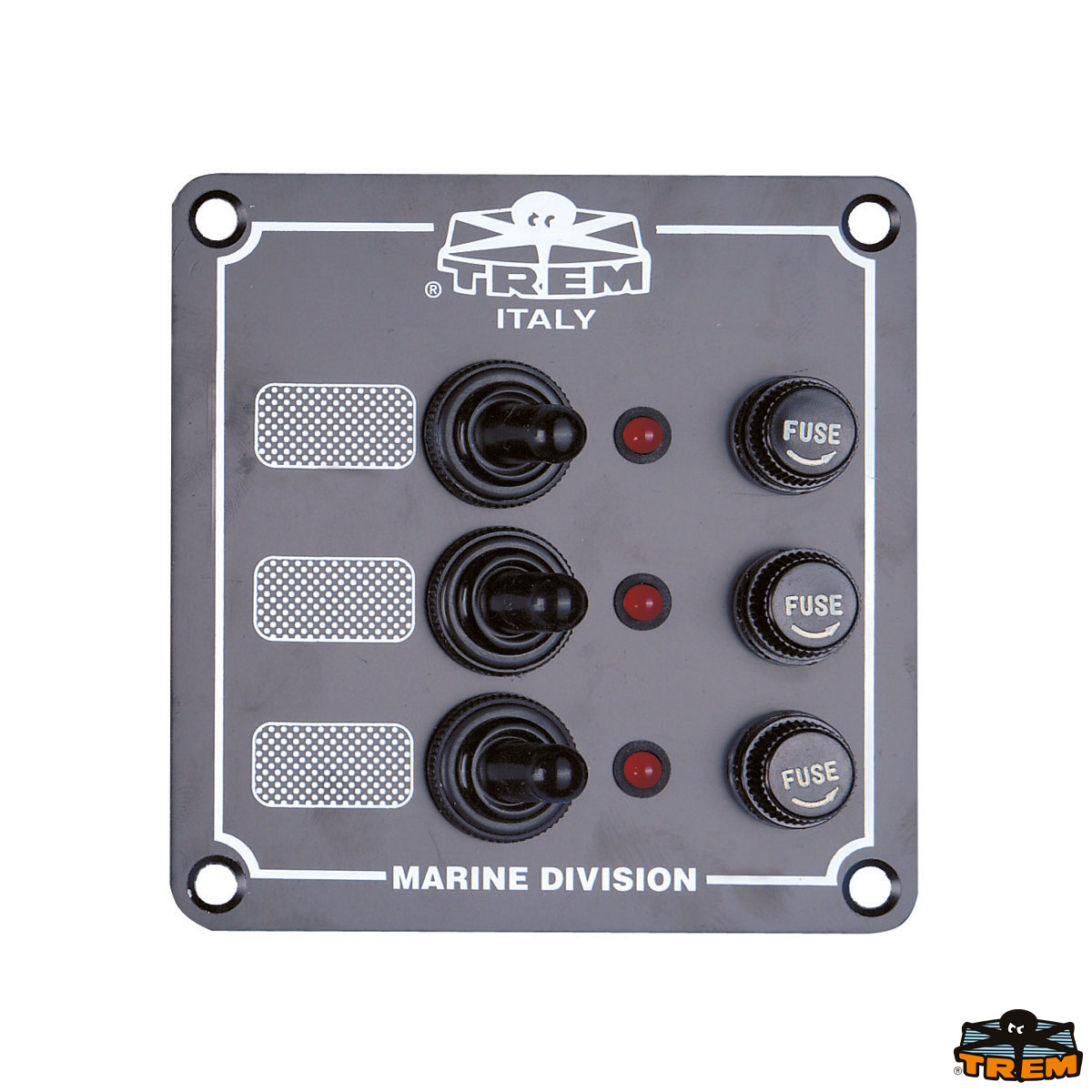 Interruttori ON-OFF tranne il primo (ON-OFF-ON) e l'ultimo (ON-OFF) con ritorno a molla per tromba. Grado di protezione IP56. Interruttori a levetta luminosi. Fusibili automatici riarmabili. Pannello in alluminio verniciato con resine epossidiche.