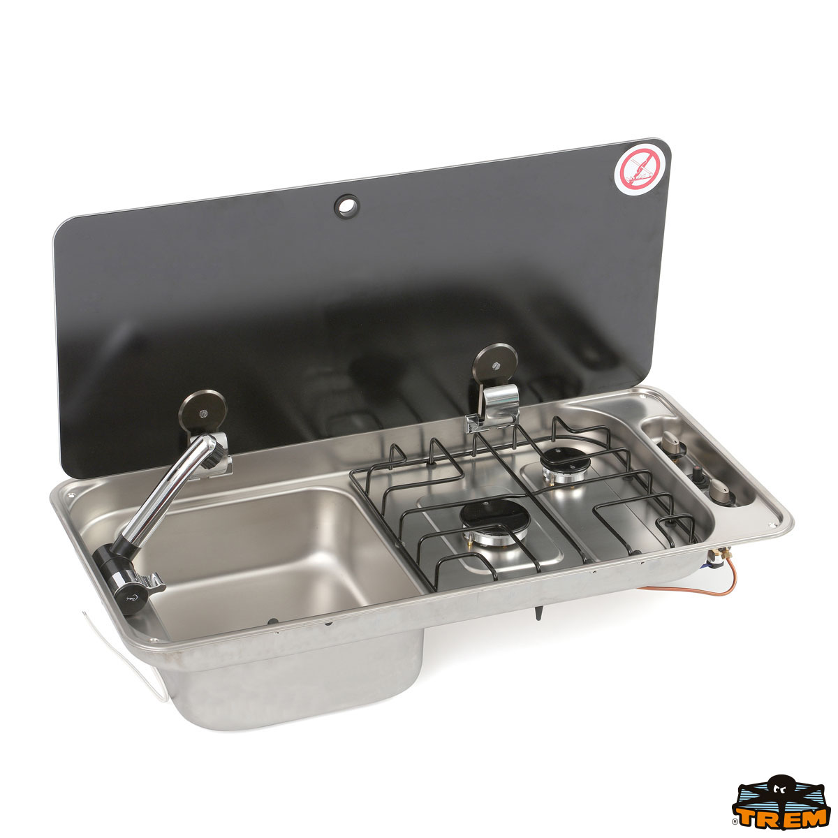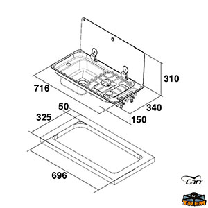 Rectangular built in stove. Made from stainless steel , 2 burner gas supply,equipped with rectangular sink, stainless steel support grid fixed with anti vibration grommets. Tempered black glass lid with concealed hinges.