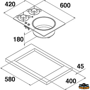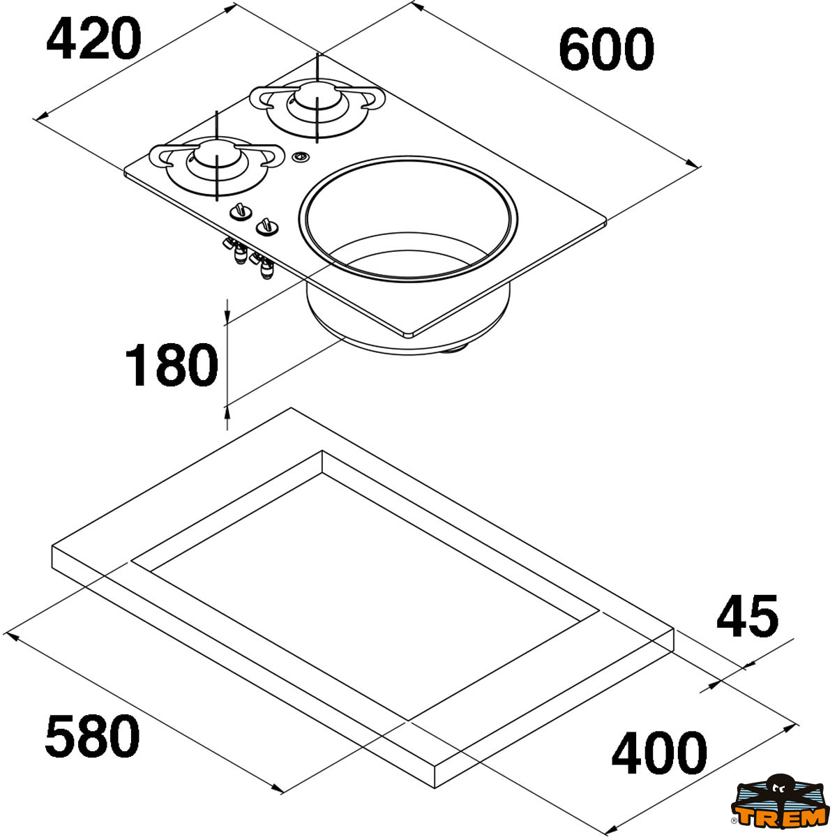 Completo di termocoppia. Alimentato a gas, piano in vetro temperato con lavello in acciaio inox 18/8.