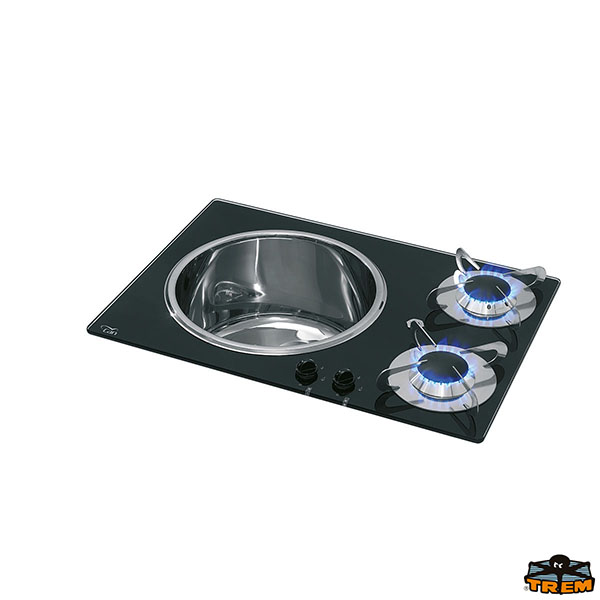 Piano cottura a gas da incasso combinato in vetro a 2 fuochi con lavello
