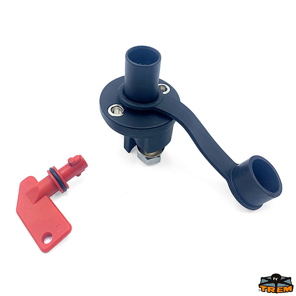 In policarbonato nero, con fissaggio su flangia. Completo di coperchio stagno in PVC e chiave anti-spruzzo in ottone nichelato. Omologato CE. Dispositivo obbligatorio da montare sul cavo positivo, norme ISO 10133.